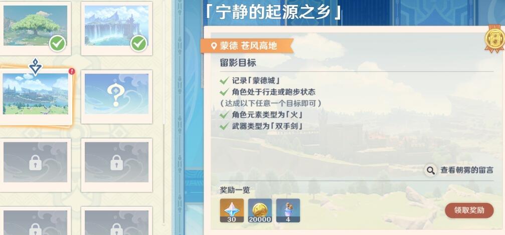 画外旅照是原神4.8版本中的一个活动,但是很多玩家都不清楚第三关宁静的起源之乡该怎么去完成,其实想压迫完成这个成就就要去到蒙德晨曦酒庄七天神像的左上方,携带火系双手剑角色在行走或跑动时拍摄照片即可,下面就和小编一起来看看原神4.8画外旅照第三关宁静的起源之乡任务图文攻略的介绍吧。