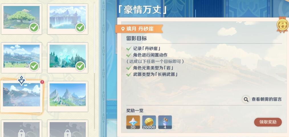 原神4.8画外旅照第五关豪情万丈要怎么完成很多玩家都不清楚,其实只要玩家去到层岩巨渊七天神像的边上,选择岩系长柄武器角色,找到一个合适的角度在触发闲置动作时拍摄照片即可完成挑战,下面就和小编一起来看看原神4.8画外旅照第五关豪情万丈任务图文攻略的介绍吧。
