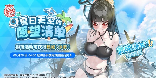 鹤城是蔚蓝档案中的一名角色,很多玩家都想知道鹤城泳装怎么获得,2024年6月27日-7月4日13:59参与【夏日天空的愿望清单】且通关【海岸公路64号】即可获得。更详细的介绍就在下文,快来一起看看吧!