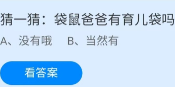 支付宝蚂蚁庄园小课6月22日的其中一个问题是: 袋鼠爸爸有育儿袋吗?这道题考查的是关于袋鼠爸爸是否有育儿袋方面的知识,下面大家快来一起看一下蚂蚁庄园6月22日的正确答案吧。